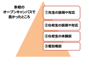 僅差で、「最新の設備・連携している隣の施設」と「オープンキャンパス」が同率2位でした。