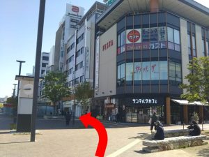 そのまま真っ直ぐ進むと、右手にカラーコンタクト屋さんが1階にあるビルが見えます。