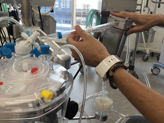 まず貯血槽というところに貯められ、ローラーポンプの力で流れ出し、人工肺で酸素を取り込んで、患者さんへ戻っていきます。