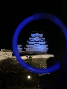 夜には姫路城までパレードし、ブルーにライトアップされているお城を見に行きました。