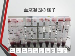 血液は出血や異物との接触で固まる性質があります(血液が固まることを血液凝固といいます)。 北野さんは温度によって血液凝固に違いがあるかを確かめました。