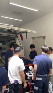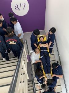 また、ストレッチャーの曳航(えいこう)や実際に傷病者をストレッチャーに乗せた状態で救急車に搬入する実習も行いました。
